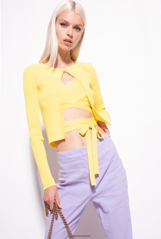 קרדיגן קצר ודק בגזרת קרפ ויסקוזה סרוג בצלעות. צוואר עגול מהודק עם וו מתכת קטן בהתאמה אישית עם הלוגו של ציפורי האהבה. - הדגם בגובה 175 ס"מ ולובש מידה 40.