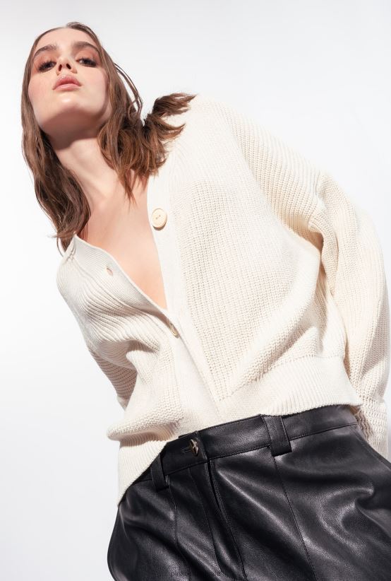 קרדיגן דייגים בשילוב כותנה סרוג בצלעות מעט גדול מדי. צווארון V ושרוולים נמוכים ארוכים בגזרה רפויה עם פירוט שרוול. הידוק כפתור קדמי. - הדגם בגובה 175 ס"מ ולובש מידה 40.