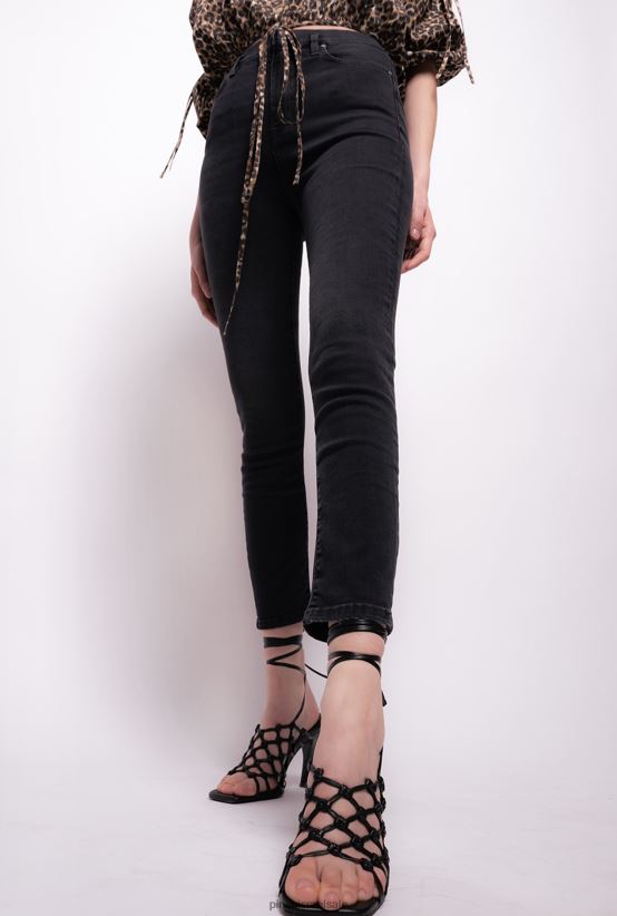 ג'ינס סקיני עם חמישה כיסים בג'ינס סטרץ' שחור. מותן גבוה עם לולאות חגורה וחגורת בד דק תואם עם אבזם ציפורי אהבה. רוכסן מתכת וכפתור חיבור.