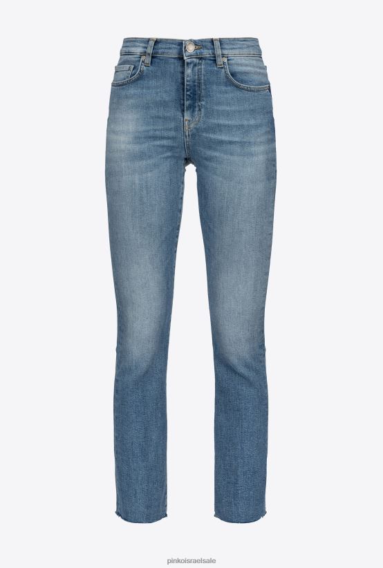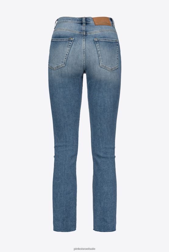 ג'ינס בגזרת מגפיים בגזרת מגפיים בג'ינס כחול נמתח, עם חמישה כיסים. מותניים רגילים, רגליים דקות שמתרחבות מעט בתחתית ובאורך הקרסול. רוכסן מתכת וכפתור חיבור.