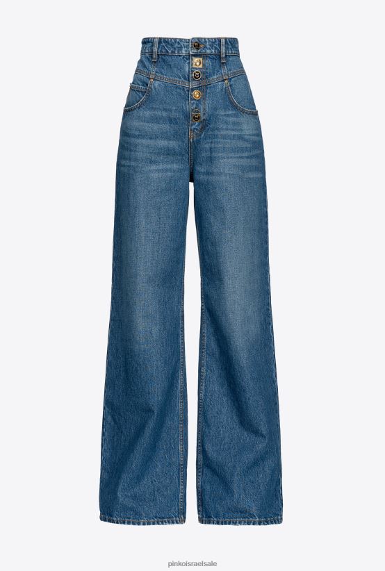 ג'ינס חמישה כיסים רחב רגליים בדנים אינדיגו. מותן גבוה במיוחד עם לולאות חגורה ורגליים משוחררות מאוד. מהודקים עם כפתורי תכשיטים שונים, כולם מותאמים אישית עם הלוגו של ציפורי האהבה.