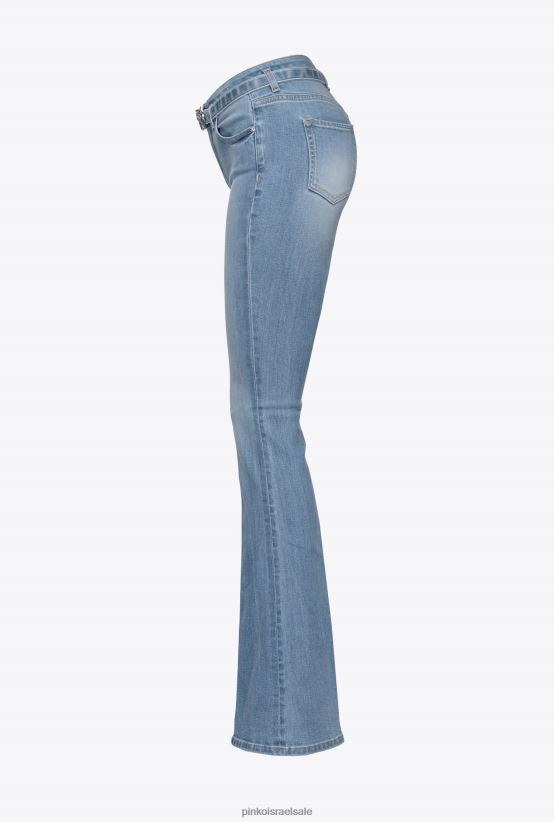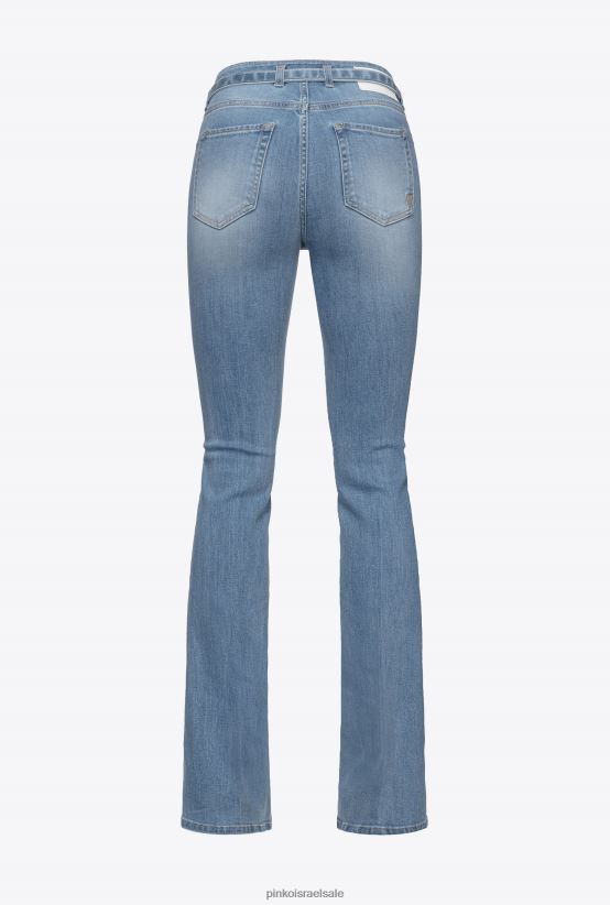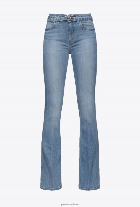 ג'ינס ג'ינס כחול נמתח עם חמישה כיסים וכביסה קלה בגזרה מתלקחת. מותניים רגילים עם לולאות חגורה, חגורת בד תואם עם אבזם בחתך יהלום מיני ציפורי אהבה, ורגליים בעלות גזרה דקות שמתרחבות למטה. רוכסן מתכת וכפתור חיבור.