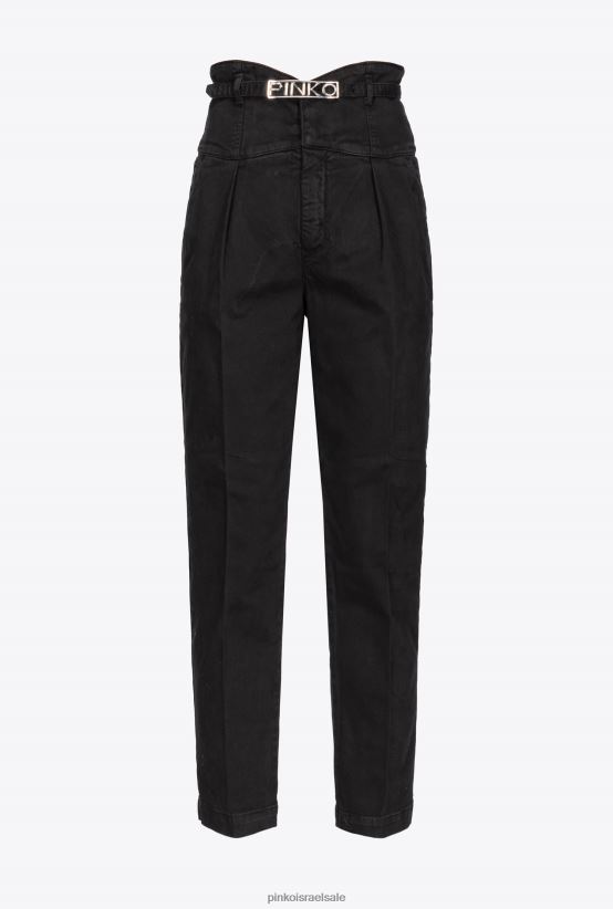 מכנסי צ'ינו מבד גבארדין כותנה נמתחת. מותן גבוה עם מבנה דמוי חזה, לולאות חגורה וחגורה דקיקה תואמת עם אבזם מתכת בהתאמה אישית עם הלוגו Pinko. כיסים קדמיים מלוכסנים, כיסי רצועות מאחור ורגליים קצוצות עם מכפלת גבוהה. רוכסן וכפתורים סמויים. - הדגם בגובה 175 ס"מ ולובש מידה 40.