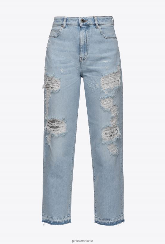 מכנסי ג'ינס עם חמישה כיסים בדנים בהיר, עם קרעים וקרעים מלפנים ומאחור. מותן גבוה עם לולאות חגורה, רגליים ישרות מעט יותר צמודות בתחתית, ושוליים בגזרה גולמית צבועה במילואים. רוכסן מתכת וכפתור חיבור.