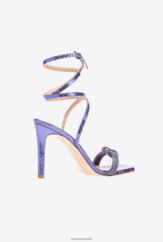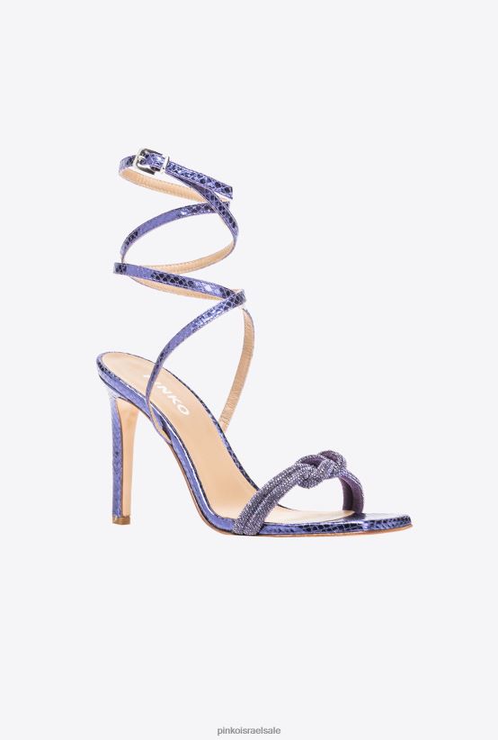 סנדלי עור בהדפס פיתון מאוכלים עם רצועת קרסול ופרטי ריינסטון בצורת קשר על הבוהן. עקב 10 ס"מ מכוסה בעור למינציה וסוליית עור.
