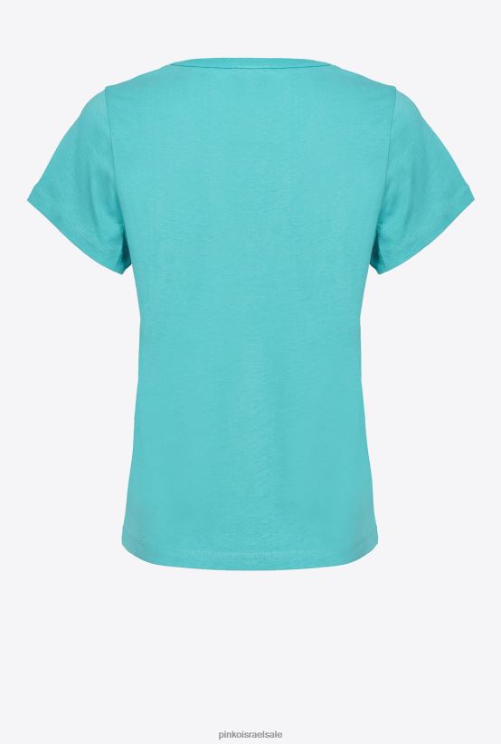 חולצת טי ג'רסי מכותנה עם שרוולים קצרים עם צווארון V מצולע והדפס ציפורי אהבה קטנות של פינקו בצד שמאל בחזית.