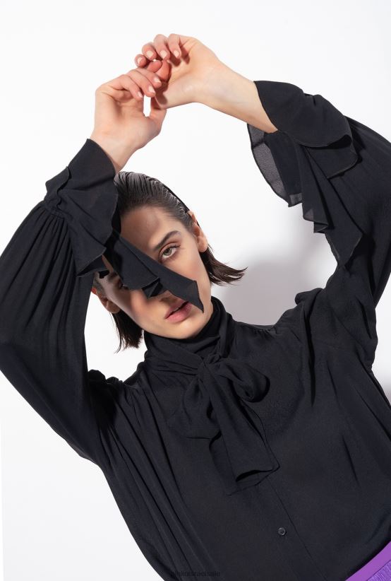 חולצת ג'ורג'ט ויסקוזה בהתאמה נוזלית עם צווארון קשת כוס. שרוולים ארוכים עם חפתים אלסטיים בשכבת סלסולים. הידוק כפתור קדמי. - הדגם בגובה 177 ס"מ ולובש מידה 40.