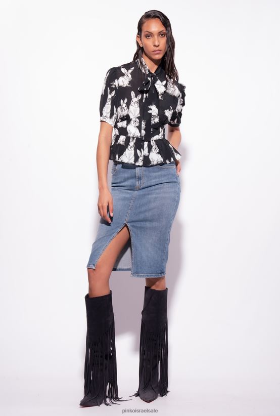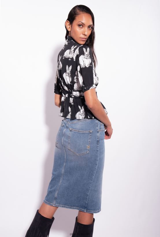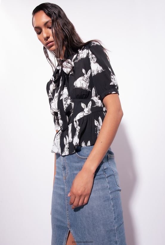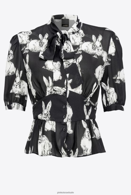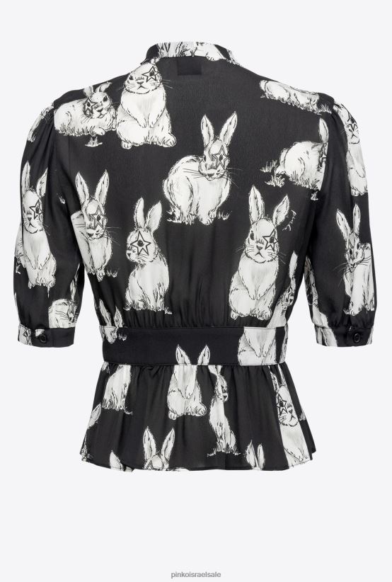 חולצת קרפ דה צ'ין קצרה ויסקוזה עם הדפס ארנב. צווארון אבנט, שרוולים קצרים תפוחים מעט וקו מותניים מעוצב בסגנון חזה. הידוק כפתור קדמי.