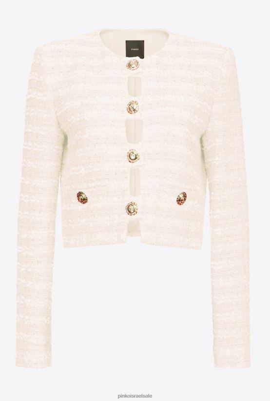 ז'קט טוויד קצר בדוגמת צוואר עגול, שרוולים ארוכים וכיסי צד מכופתרים. פנים מרופד. הבגד הזה נצמד עם כפתורי מתכת זהובים וכולל גזרות עד הסוף.