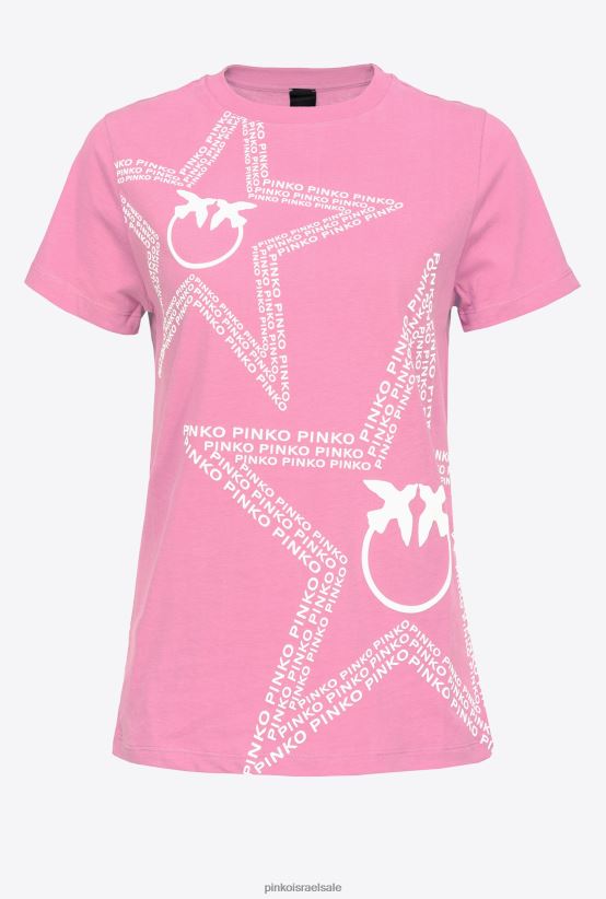חולצת טי מבד ג'רזי מכותנה עם שרוולים קצרים עם לוגו פינקו מודפס הכוללת כוכבים גדולים עם ציפורי אהבה באמצע. - הדגם בגובה 176 ס"מ ולובש מידה 40.