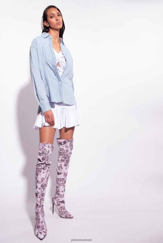 חולצת ג'ינס בהירה מעט אוברסייזית, עם דוגמה בחיתוך לייזר עם האות 'p' ולוגו ציפורי האהבה על כל הגוף. צווארון קלאסי, שרוולים ארוכים ונמוכים ומכפלת מעט ארוכה יותר מאחור. הידוק בלחיצה.