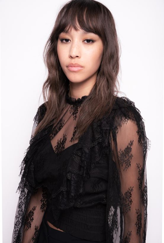 חולצת תחרה קצוצה עם דפוס פרחוני וריצה. שרוולים ארוכים עם חפת מצויץ ורצועה מעוטרת בתחתית. הידוק מרכזי קטן מעוטר כפתורים מאחור.