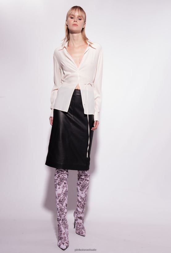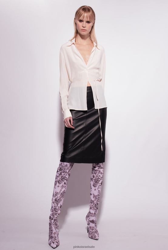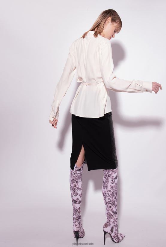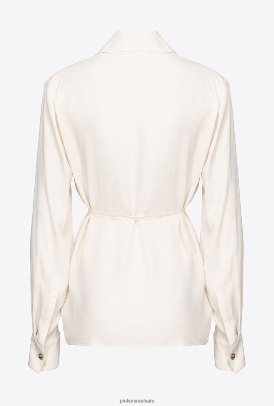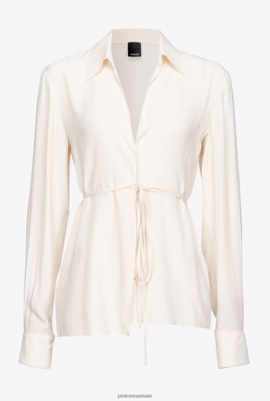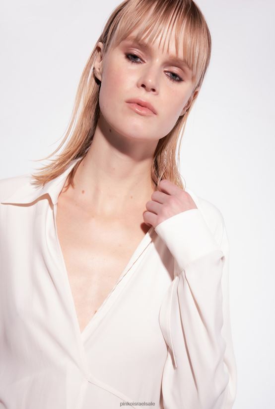 חולצה נשית בקרפ דה צ'ין בתערובת משי. צווארון מחודד עם צווארון V ושרוולים ארוכים עם שרוול מעוטר כפתורי תכשיט. מהודקים עם קשירה במותניים. יצירה זו עשויה מחומר - מאושר לאורך שרשרת הייצור - מיערות המנוהלים בהתאם לעקרונות הקיימות.