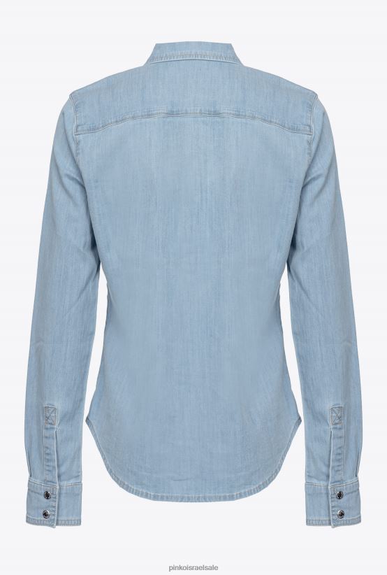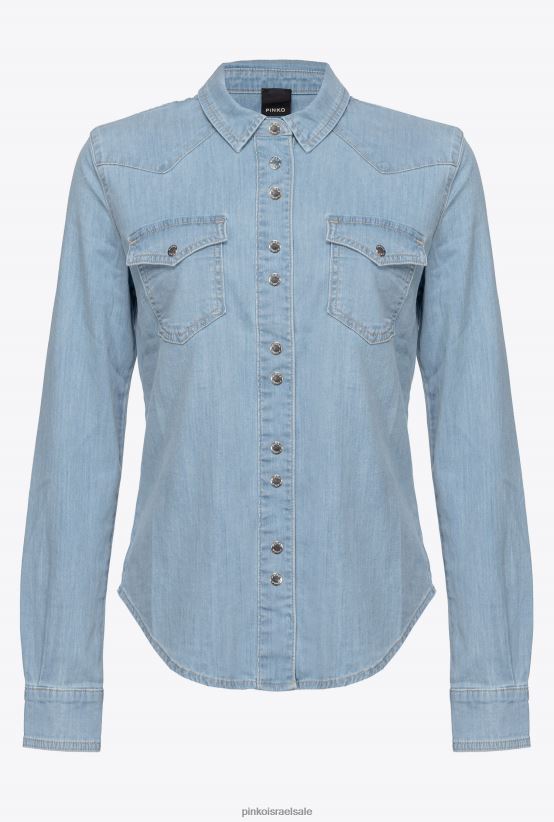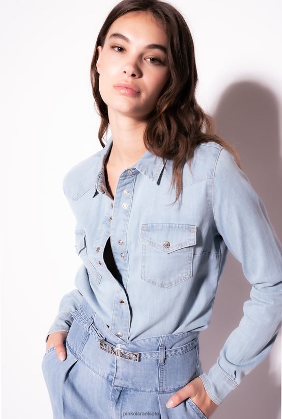 חולצה בדנים אריג בהיר, עם כיסי דש קטנים עם כפתור מתכת בחזית. צווארון קלאסי בעל גזרה דקיקה, שרוולים ארוכים עם שרוול וכפתור, ושוליים מעוקלים מלפנים ומאחור. מהודקים עם כפתורי מתכת, מלבד הכפתור הראשון שיש לו חור כפתור. - הדגם בגובה 178 ס"מ ולובש מידה 40.