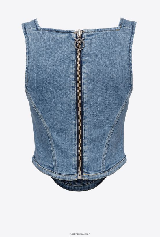 חלק עליון ללא שרוולים בסגנון גוזיות בג'ינס בשילוב כותנה. צווארון מרובע רחב מלפנים, תפירה עליונה גלויה ותחתית מחודדת מלפנים. הידוק רוכסן מתכת באמצע מאחור ומשיכה בהתאמה אישית עם לוגו ציפורי אהבה.