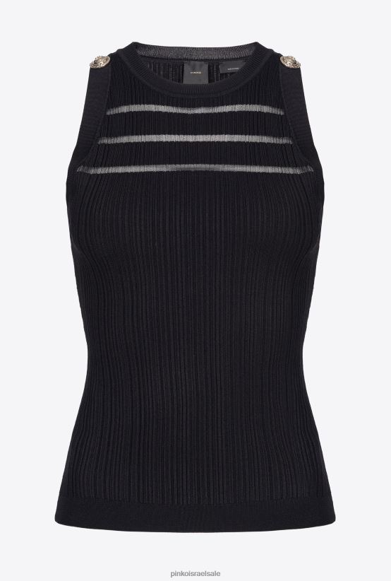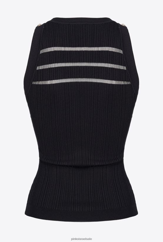חלק עליון ללא שרוולים בגזרה דקיקה בגזרת ויסקוזה מתיחה בסריג צלעות עם פרטים שקופים מלפנים ומאחור. כתפיים מעוטרות בכפתורי מתכת זהוב. - הדגם בגובה 175 ס"מ ולובש מידה 40.