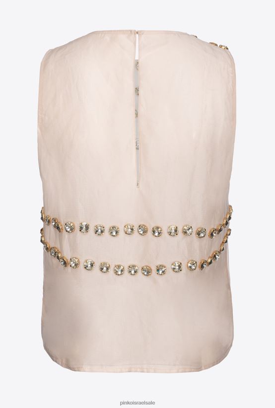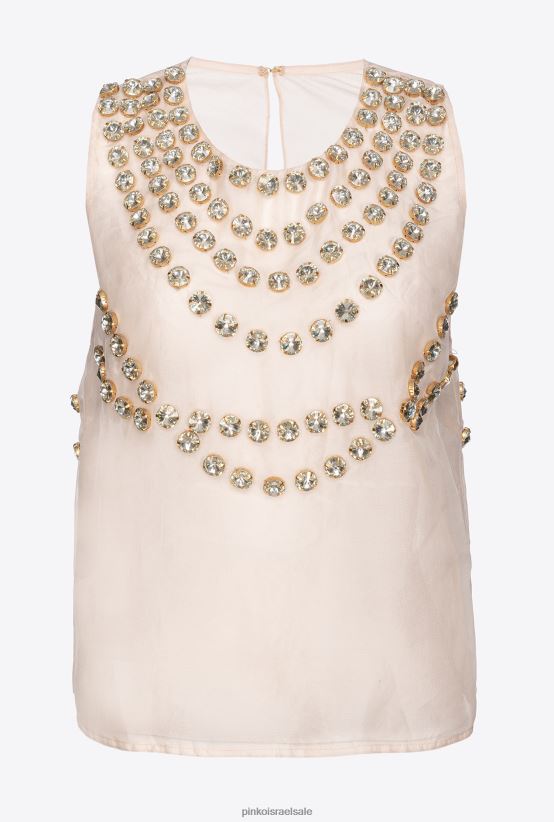 חלק עליון ללא שרוולים בשיפון בהיר, עם רקמה מבריקה מעוטרת צ'אטון היוצרת אפקט של שרשרת מרובה גדילים. צוואר עגול וחור מפתח מהודק באמצע הגב.