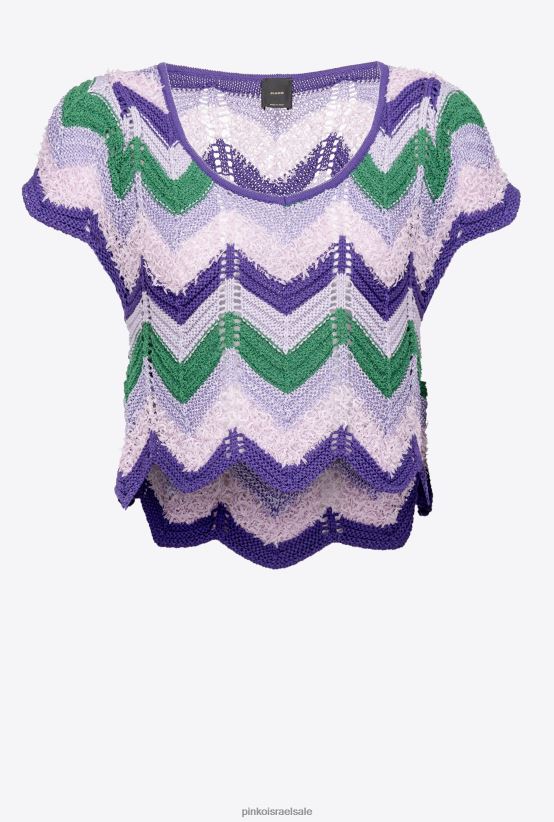 טופ קרופ בסריג קרושה עם פירוט זיג-זג צבעוני ולורקס מושחל בחומר. צוואר עגול צונח, שרוולים קצרים ושולי מסולסל. - הדגם בגובה 178 ס"מ ולובש מידה 40.