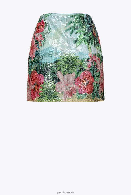 חצאית מיני בגזרה ישרה עם רקמת פאייטים על כל הגוף והדפס נוף טרופי עם פרחים ועצי דקל. מרופד. מהודק עם רוכסן צד בלתי נראה. - הדגם בגובה 178 ס"מ ולובש מידה 40.