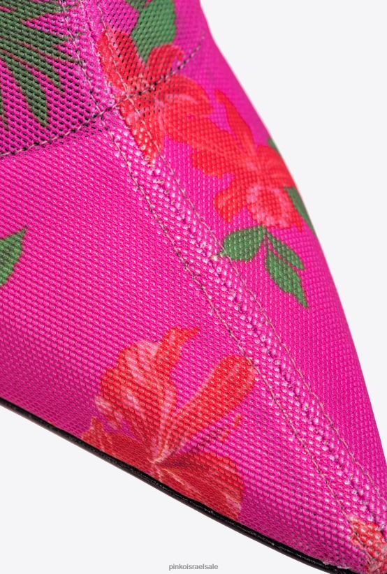 מגפונים מבד רשת נמתח צמוד, עם הדפס פרחוני דקורטיבי. בוהן מחודדת וסוליית עור עם עקב סטילטו באורך 10 ס"מ. מדרס מרופד.