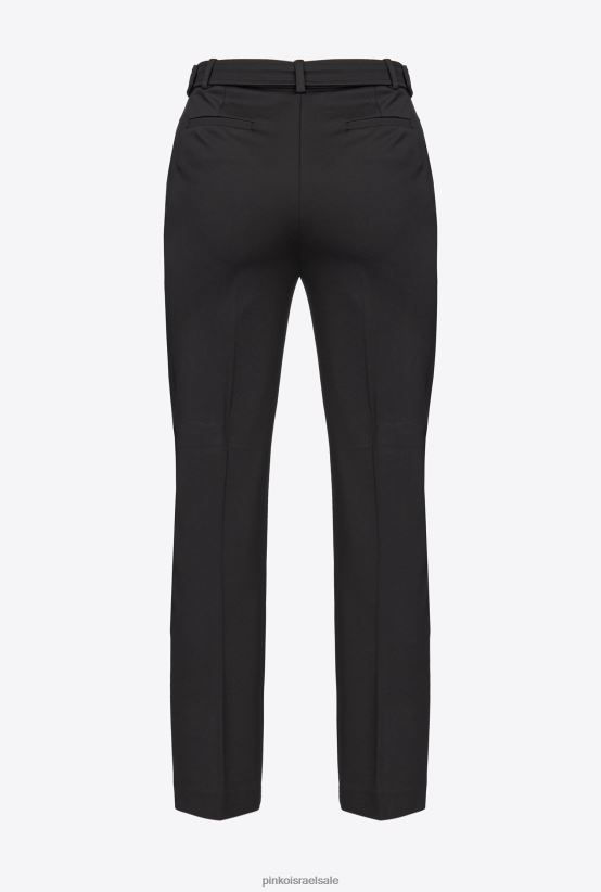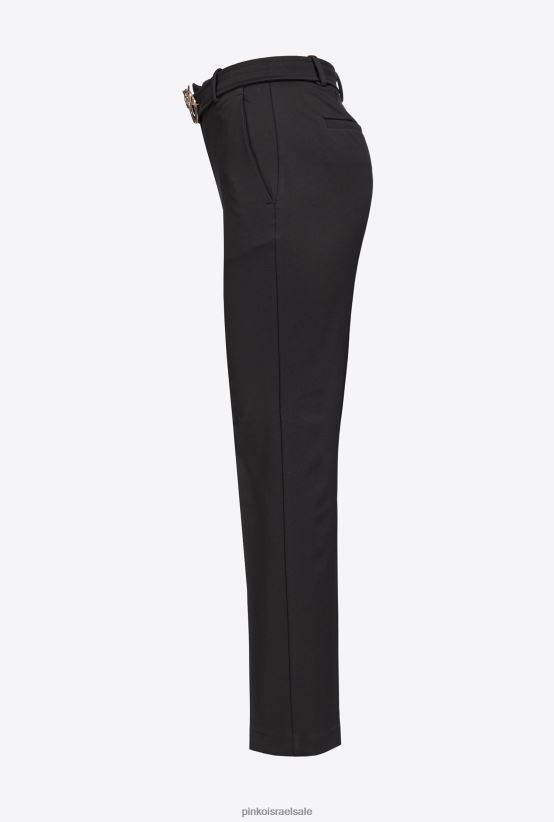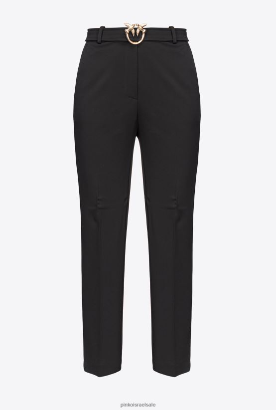 מכנסיים דקים מבד ויסקוזה סטרץ' טכני, סריגת מילאנו מלאה, בגימור מיוחד באפקט סקובה. מותן גבוה עם לולאות חגורה וחגורת בד תואם עם אבזם חיתוך יהלום של ציפורי אהבה ממתכת, כיסי צד מלוכסנים וכיסי רצועות מאחור. הידוק רוכסן וו. - הדגם בגובה 175 ס"מ ולובש מידה 40.