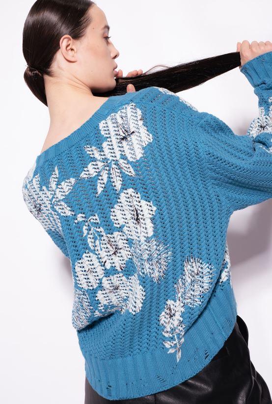 סוודר בגזרה נינוחה מבד חצי כותנה סרוג דייגים עם הדפס פרחוני גרפי. צווארון V ושרוולים נמוכים ארוכים. - הדגם בגובה 175 ס"מ ולובש מידה 40.