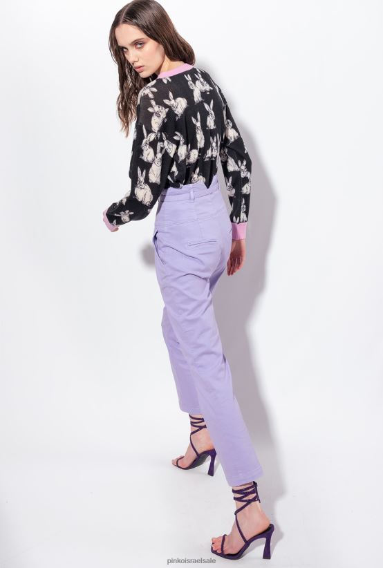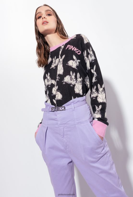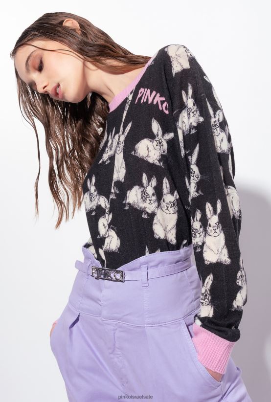 סוודר חוט צמר טהור רך עם מוטיב ארנב בכל רחבי. חפתים מצולעים בצבע מנוגד וצווארון עגול. - הדגם בגובה 175 ס"מ ולובש מידה 40.
