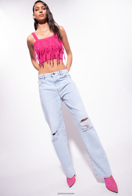טופ קרופ ללא שרוולים מבד כותנה בכבלים, ללא הידוק ורצועות מעוטרות בחרוזים גווניים. רצועות כתף דקות, מכפלת מצולעת וצוואר ישר.