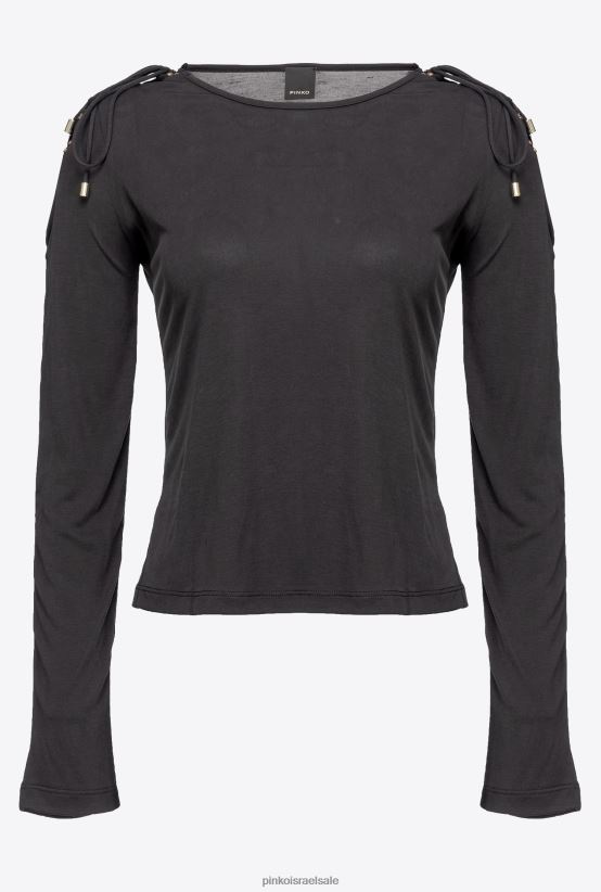 טופ עם שרוולים ארוכים בג'רזי מודאלי קל, עם צווארון סירה ושרוך בקצה מתכת על הכתפיים.