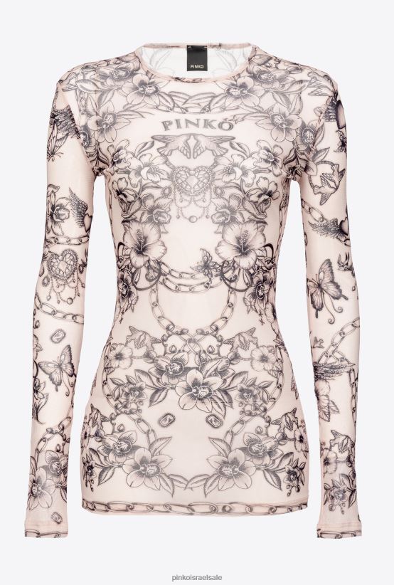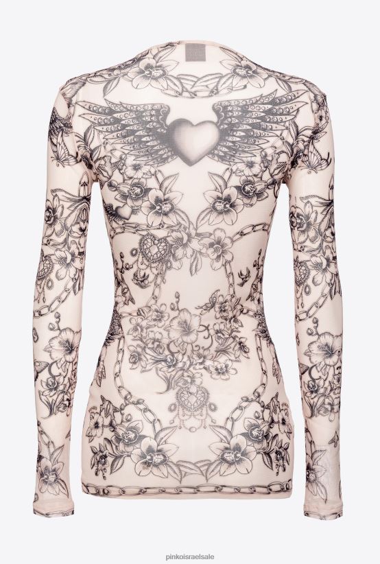 טופ טול שרוולים ארוכים עם הדפס קעקועים. חלק מצויד עם צוואר עגול.