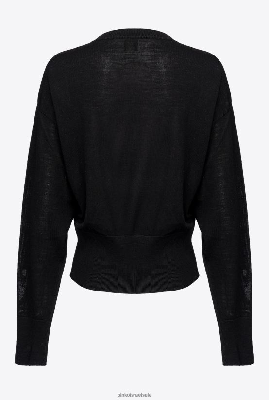 סוודר מבד 100% צמר עם טלאי דובדבן רקום בחזית. צווארון עגול, שרוולים ארוכים ורצועת צלעות רחבה בתחתית.