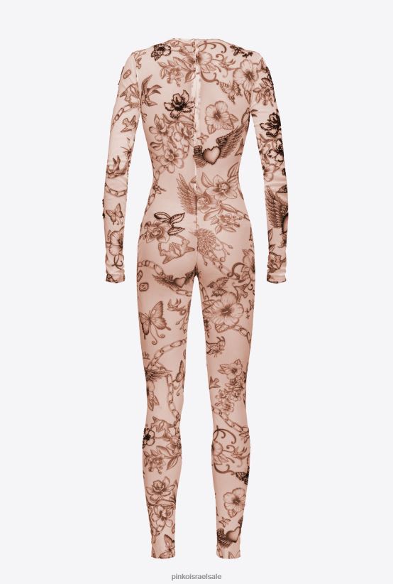סרבל צמוד עם שרוולים ארוכים בטול מתיחה עם הדפס קעקוע על-פני הכל וחרוזים שחורים בחזית. רוכסן מרכזי נסתר מאחור.