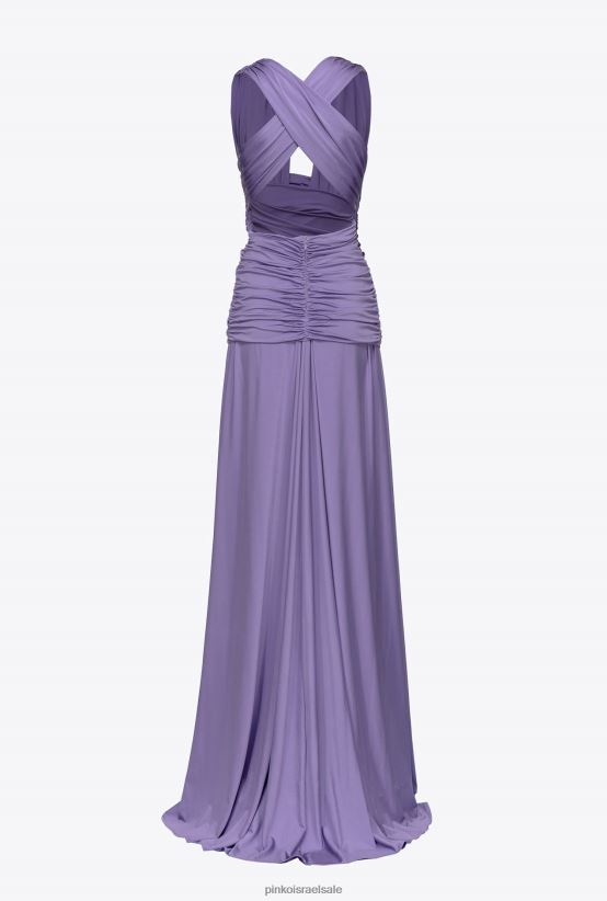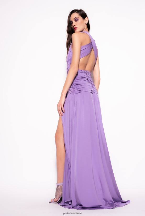 שמלה אלגנטית ארוכה ללא שרוולים מבד ג'רסי עם מרקם מבריק ייחודי ופרטים מכוסים. צווארון קדמי צונח עם רצועות כתף רחבות החוצות את עיצוב הגב הפתוח ואפקט מוצלב במותן. חצאית ארוכה עם קפלים רכים וחריץ מקסי קדמי. רוכסן מרכזי נסתר מאחור. - הדגם בגובה 177 ס"מ ולובש מידה 40.