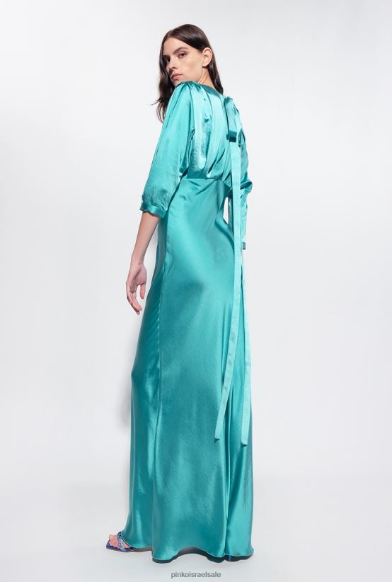 שמלת סאטן ארוכה ואלגנטית עם חלק עליון מעט רופף, צווארון צונח מלפנים, שלושה שרוולים באורך רבע וחור מפתח עם קשירה ארוכה שנקשרת לקשת באמצע מאחור. קו מותן אימפריה וחצאית ארוכה, נשפכת ונשית. - הדגם בגובה 176 ס"מ ולובש מידה 40.