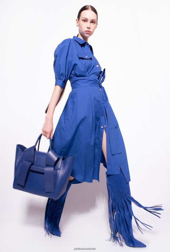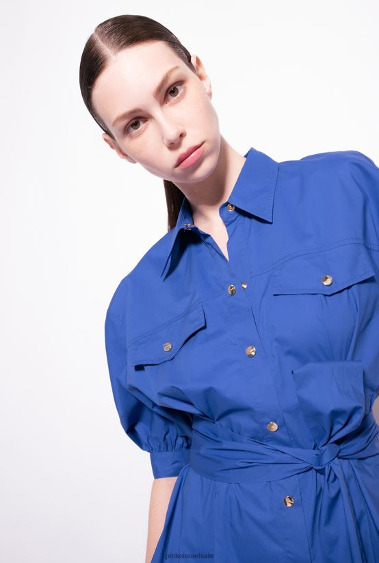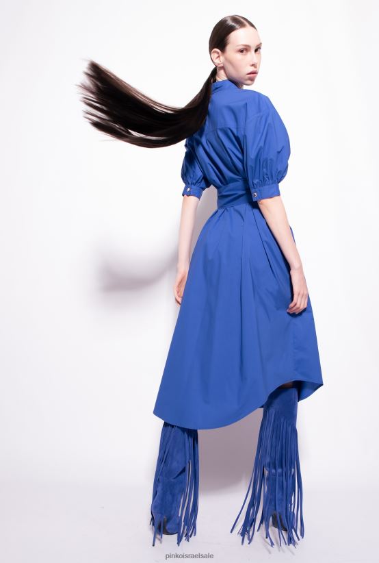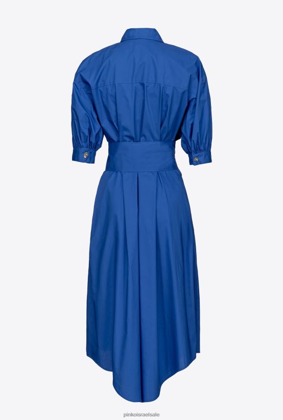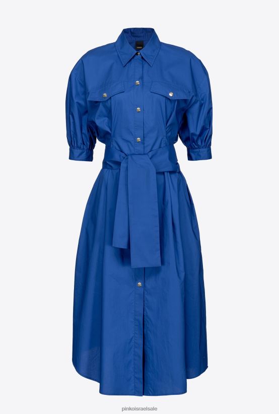 שמלת חולצה באורך בינוני מכותנה פופלין. צווארון חולצה, כיסי חזה עם דש מחודד וקפלים בחזית, ושרוולים קצרים תפוחים עם שרוול. חגורת אבנט מבד תואם לקשירה במותן, חצאית רפויה באורך מידי עם קפלים וכיסי צד בתפר, ושולי מחודדים מאחור. הידוק כפתור קדמי. - הדגם בגובה 178 ס"מ ולובש מידה 40.