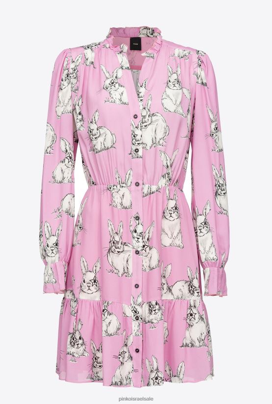שמלת חולצת קרפ דה צ'ין קצרה עם הדפס ארנב אופקי. צווארון עגול משופשף, שרוולים ארוכים, מותניים צמודים וחצאית קצרה עם מכפלת. הידוק כפתורים. - הדגם בגובה 177 ס"מ ולובש מידה 40.