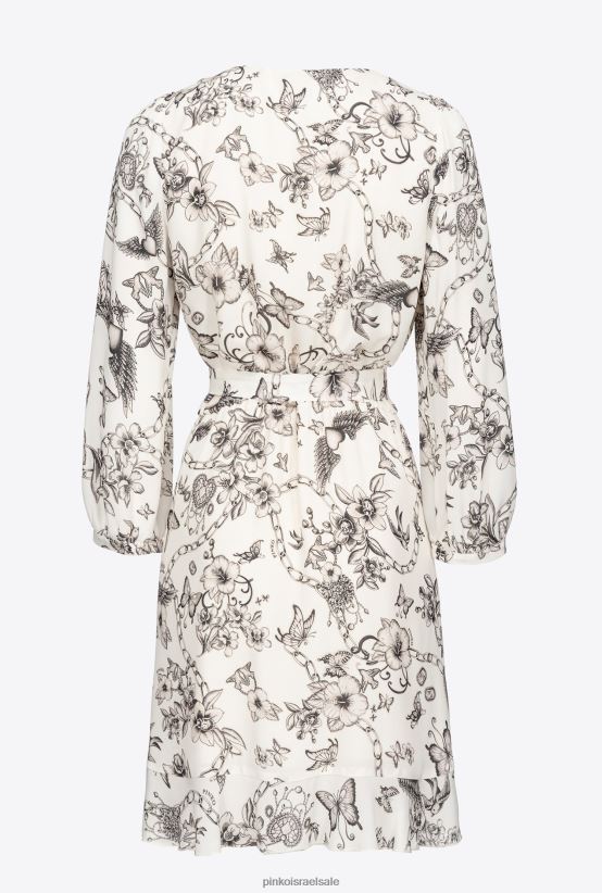 שמלת מעטפת קצרה בקרפ דה צ'ין ויסקוזה, עם הדפס קעקועים. צווארון V מוצלב מלפנים, 3/4 שרוולים ושולי עם סלסול. לולאות חגורה במותן וחגורת קשירה מבד תואם במותניים. - הדגם בגובה 178 ס"מ ולובש מידה 40.