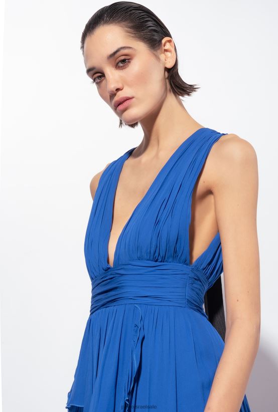 שמלה ארוכה במיוחד ללא שרוולים בצבע ויסקוזה בהיר ג'ורג'ט. צווארון V צונח מהודק עם סרטים ארוכים מאחור שמתעטפים בחופשיות כשהם קשורים. קו מותן אמפייר וחצאית א-סימטרית עם חזית קצרה וגב וצדי ארוכים במיוחד עם שוליים ושוליים מצויצים. רוכסן מרכזי נסתר מאחור. - הדגם בגובה 177 ס"מ ולובש מידה 40.