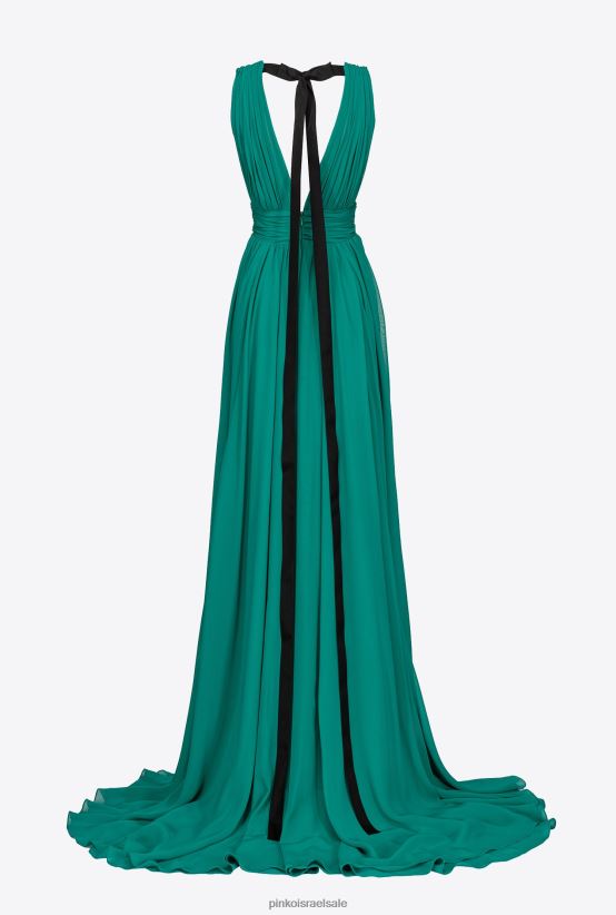שמלה ארוכה במיוחד ללא שרוולים בצבע ויסקוזה בהיר ג'ורג'ט. צווארון V צונח מהודק עם סרטים ארוכים מאחור שמתעטפים בחופשיות כשהם קשורים. קו מותן אמפייר וחצאית א-סימטרית עם חזית קצרה וגב וצדי ארוכים במיוחד עם שוליים ושוליים מצויצים. רוכסן מרכזי נסתר מאחור. בגד זה הוא חלק מקולקציית קפסולות בגדי המסיבות "שמלה להרשים".