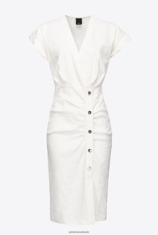 שמלה דקיקה באורך הברך בפשתן מתיחה. צווארון V מוצלב מלפנים, שרוולים קצרים עם קצוות חפתים וחצאית עד הברך. כפתור מעט אסימטרי בחזית. - הדגם בגובה 178 ס"מ ולובש מידה 40.