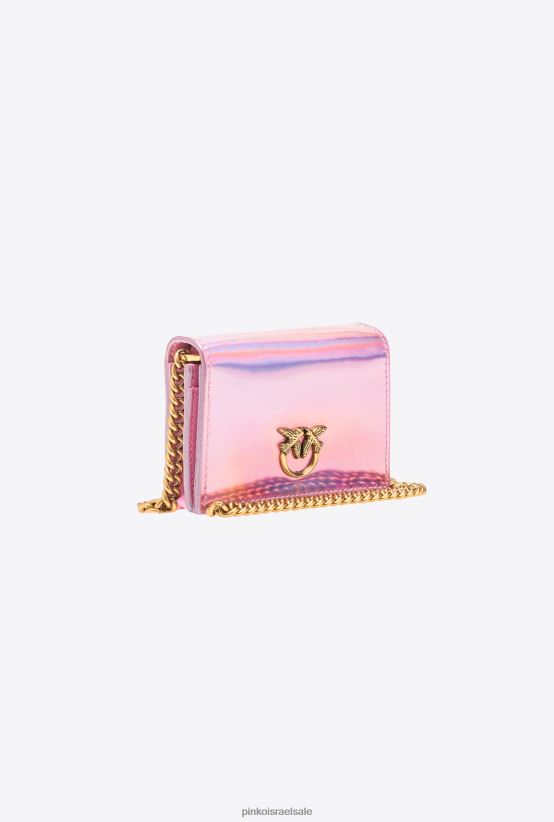 מחזיק כרטיס אשראי מעור במראה ססגוני עשוי מעור איטליה: מתקבל באמצעות תהליך שיזוף בלעדי בו ריסוס העור מספר פעמים, בשילוב טכניקה דיגיטלית בשילוב חום ולחץ לשכפול אפקט הלמינציה הססגנית והאטומה. הדש הקדמי מותאם אישית עם לוח מתכת בחיתוך יהלום של ציפורי אהבה. רצועת כתף עם שרשרת דקה נשלפת. האביזר הוא חלק מקולקציית הקפסולה המיוחדת במהדורה מוגבלת הכוללת דגמים בלעדיים של Pinko Galleria במהדורה מוגבלת.